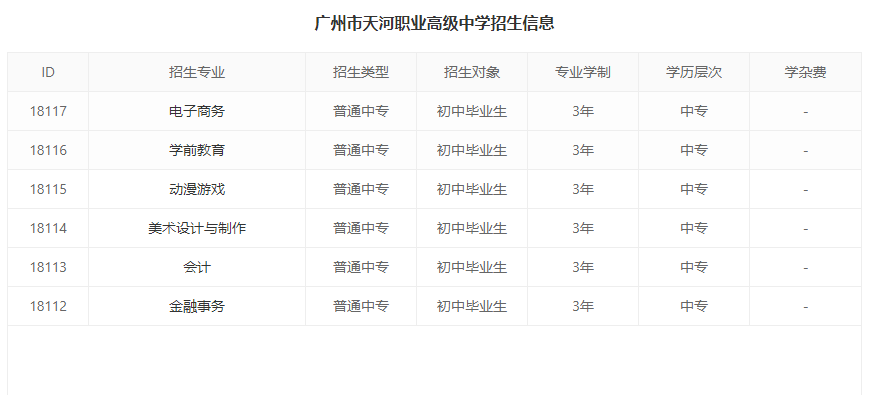 广州市天河职业高级中学是广州市天河区唯一一所公办国家级重点中等职业学校,学校分设沙河校区、棠德校区、天河职中骏景稚乐幼儿园、天河职中华悦山庄幼儿园。目前,开设有十二个专业,其中,金融事务、计算机网络技术、软件与信息服务是广东省重点建设专业,学前教育、商务英语、美术设计与制作是广州市重点建设专业。学校是广东省中等职业教育计算机软件技术、计算机网络技术“实训中心”。是一所校风好、教风正、实训严、质量高、社会声誉好的国家级重点中等职业学校。